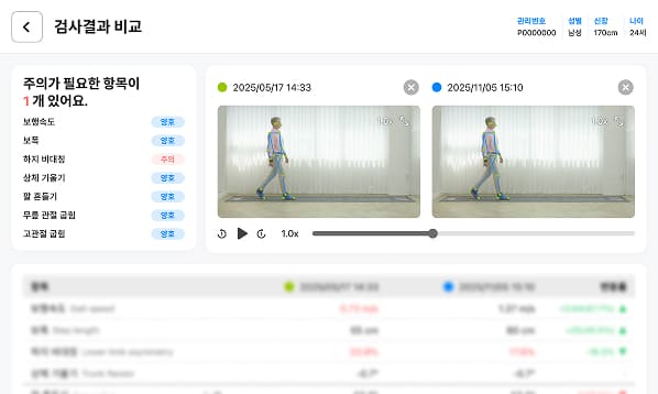 보행속도, 보폭, 상체굽음, 좌우비대칭,